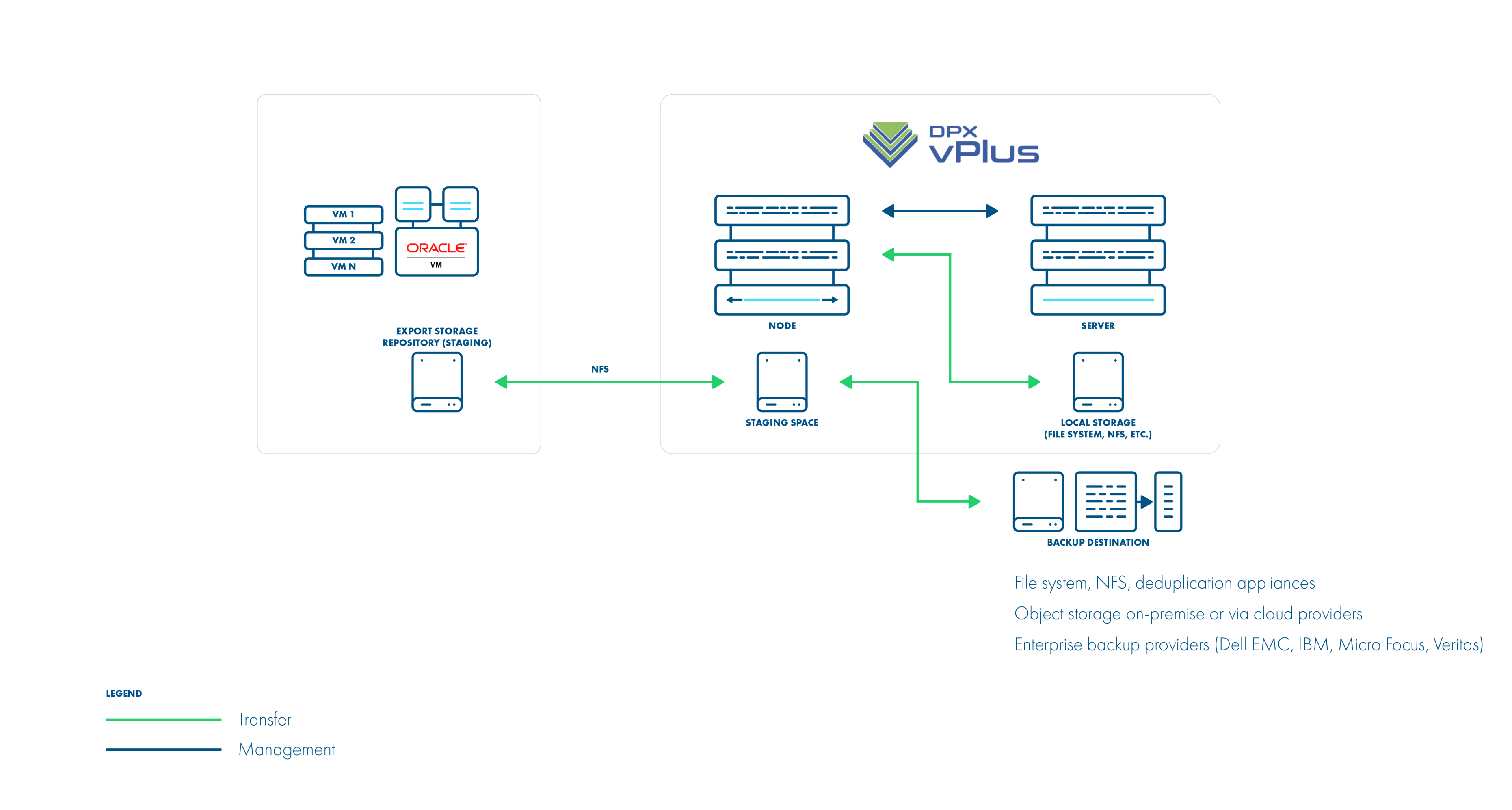 • data + metadata exported by the manager to the vPlus staging space (visible as the export Storage Repository in OVM)