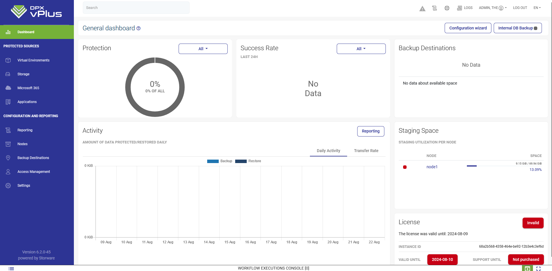 The Protection field present the overall statistics about protection of your environment. The instance is considered protected when it is attached to Backup SLA with schedule and the backup has been done successfully in the last 24 hours.