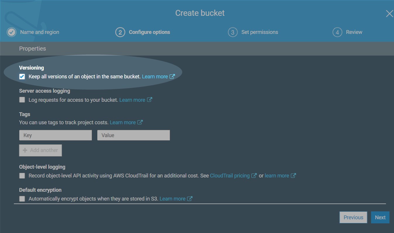In Configure options activate versioning: