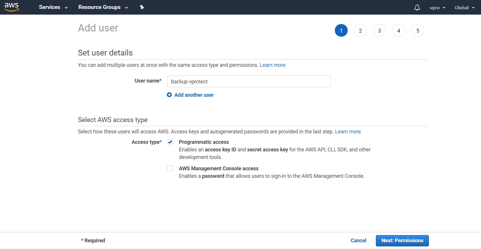 Remember to choose the Programmatic access account type: