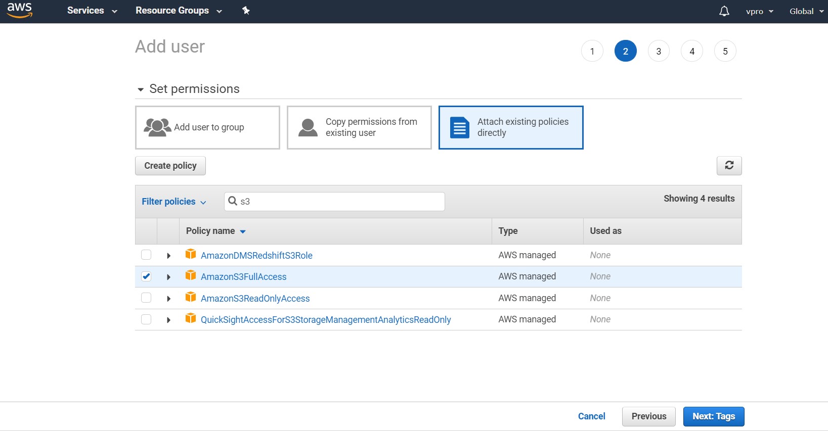 From the predefined roles, you can choose AmazonS3FullAccess or you can create a new one as described in the Permissions section: