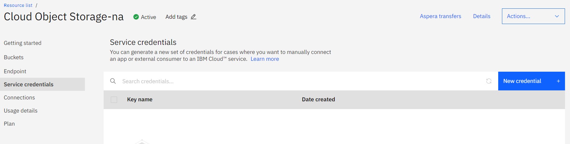 We are almost done here, now we need to create API access and a secret key. Go to "Service credentials" on the left side menu, then create new credentials using the blue button on the right.