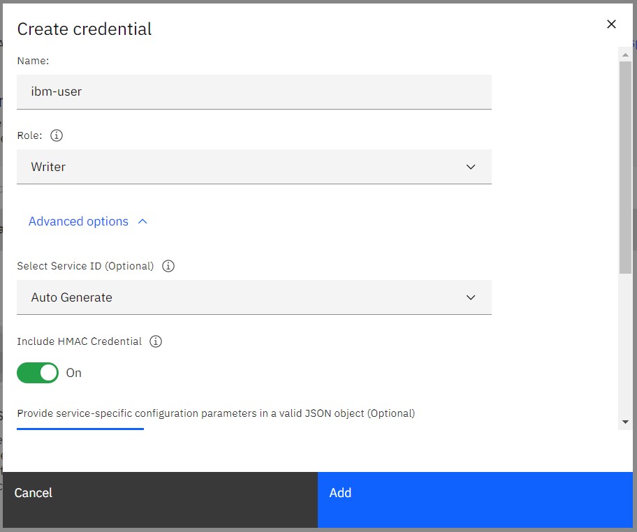 There are two important options on this screen. You must select the appropriate role (for vPlus it is the "Writer" role) and select the option "Include HMAC credential".