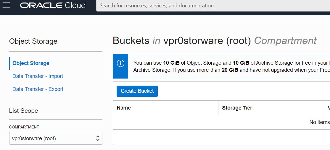 Log in to the Oracle cloud dashboard, expand the left side menu and go to the Object Storage tab.
