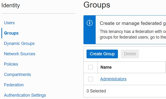 Then go to the Groups page, which you can also find under the identity tab on the left side menu.