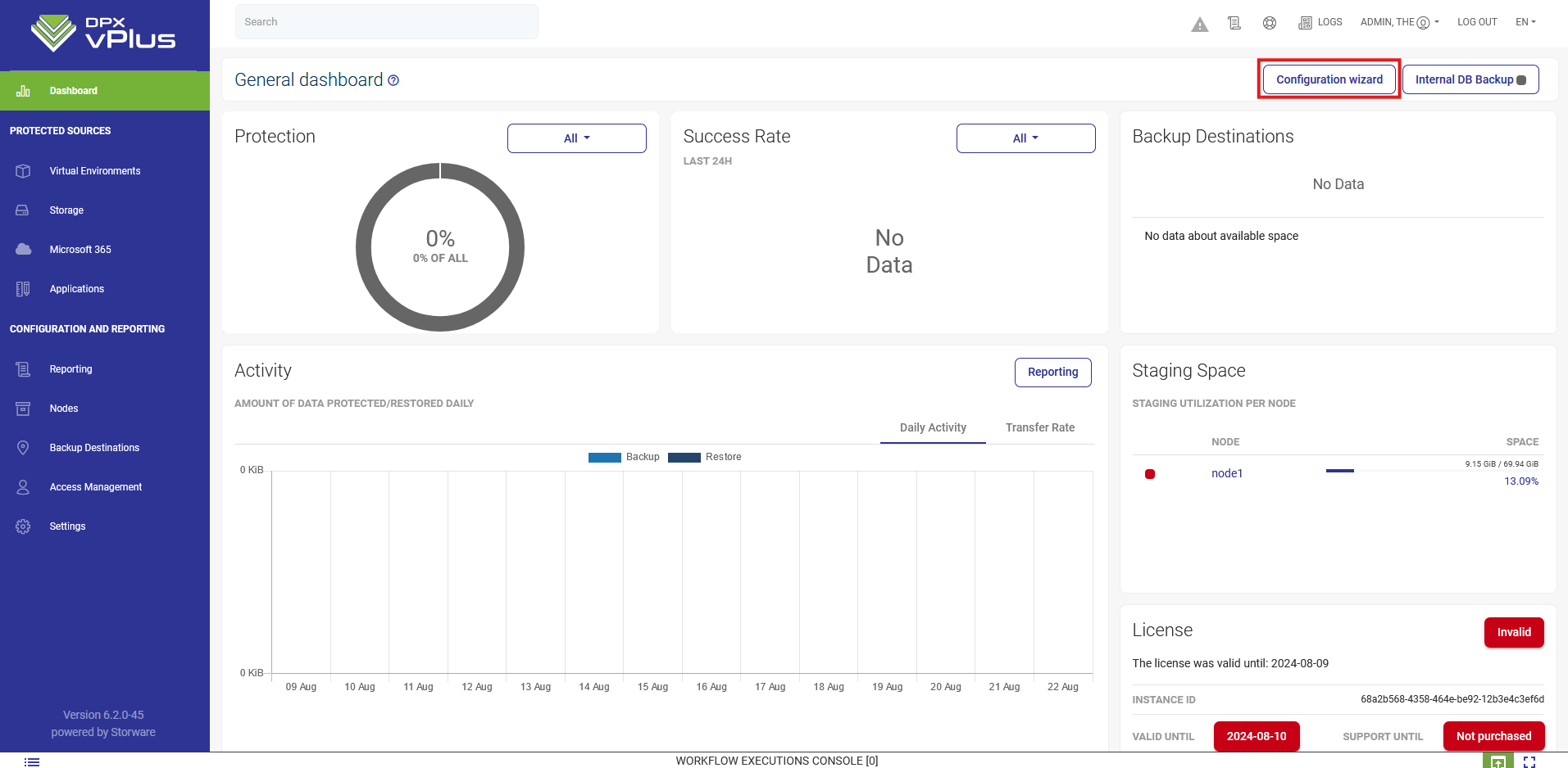 The configuration wizard can be accessed from the main dashboard by clicking on the Configuration wizard button on the right.