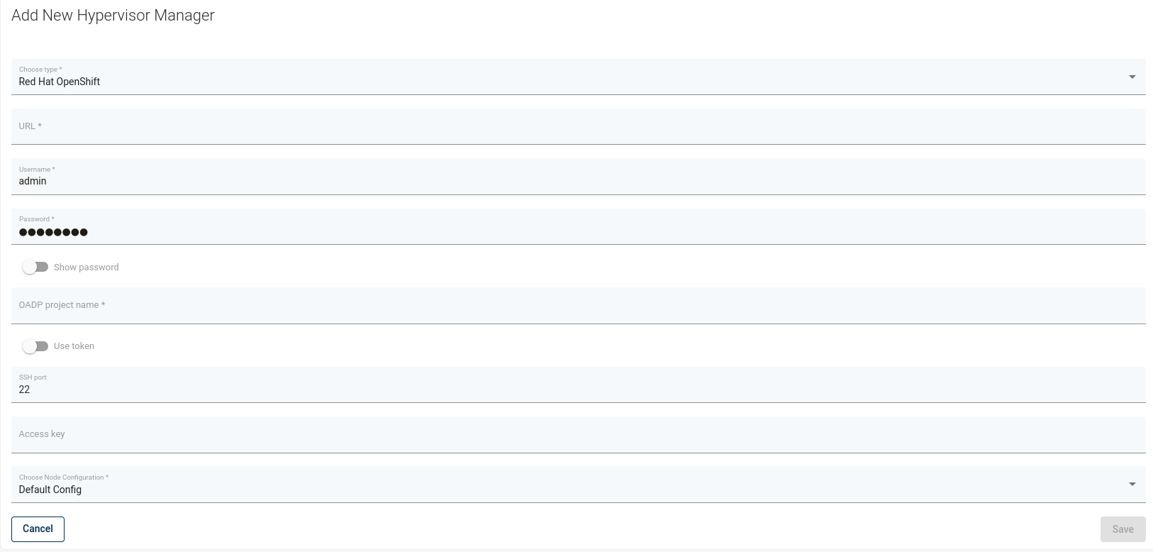 - Please provide the URL to the Openshift API, credentials to the cluster and OADP project name when creating the OpenShift hypervisor manager in vPlus WebUI. This is needed for vPlus to have access to your cluster deployments.