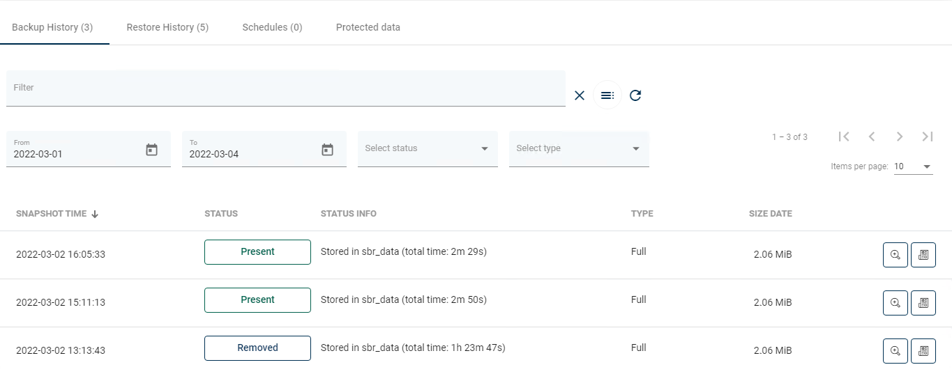 This tab shows information about all backups made, as well as information about failed, removed (because of retention), or currently executing backups.