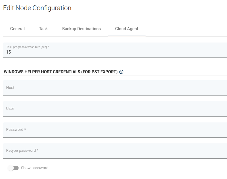 - Go to Nodes -> Node Configurations and edit existing node configuration. Click on Cloud Agent tab and type access credentials to your Windows machine which will be used to generate PST.