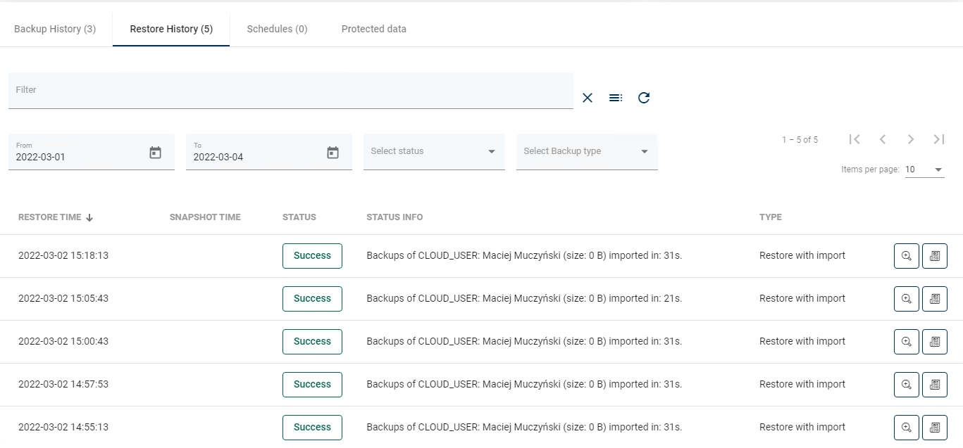 This tab is similar to "Backup History". This is a list with basic information about restores performed. When you open the details of the selected restore, you will see more detailed information.