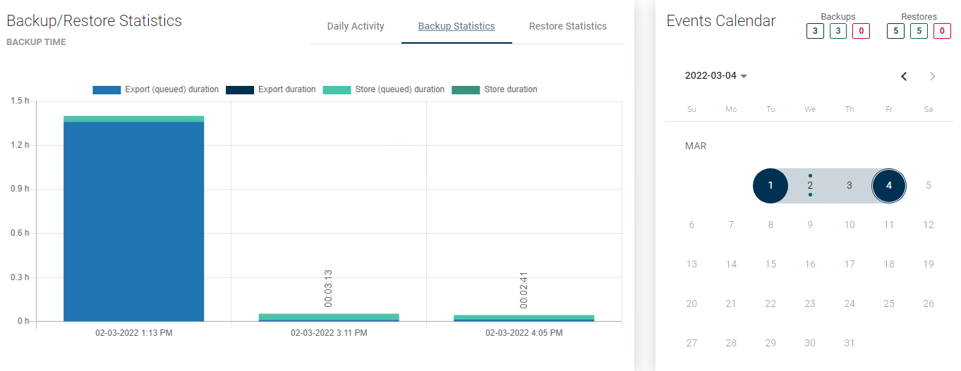 The calendar extends the possibilities of adjacent statistics. It allows you to neatly define the range of days you want to see, additionally makes a quick summary of the number of backups and restores (top right corner).