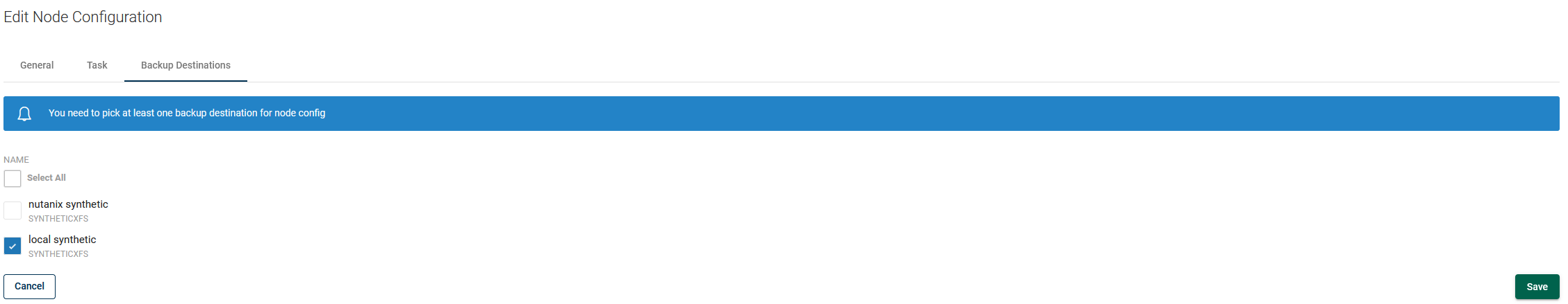 This section is used to add/remove backup destinations to the nodes using this configuration. Only backup destinations enabled here can be used by the nodes.