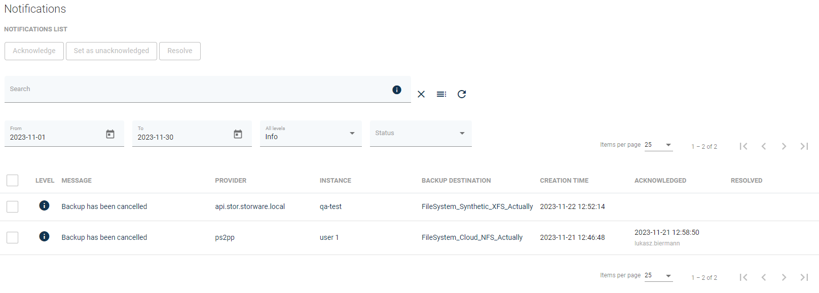 Information about the username and date of the action will be registered and displayed in the main notifications view