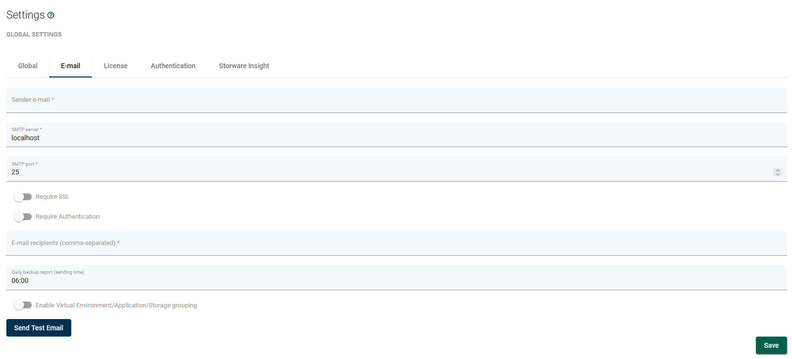 Sender e-mail- address from which should e-mail be sentSMTP server- SMTP server addressSMTP port- SMTP server portSMTP SSL port- SMTP SSL port (if enabled)SMTP user- SMTP account used to send e-mailsE-mail recipients (comma-separated)- list of recipients of daily backup reportDaily backup report (sending time)- a time when a daily backup report should be sentDaily backup report- sending time for summary reportEnable virtual environment/application grouping- you can group the environment by selected parameter