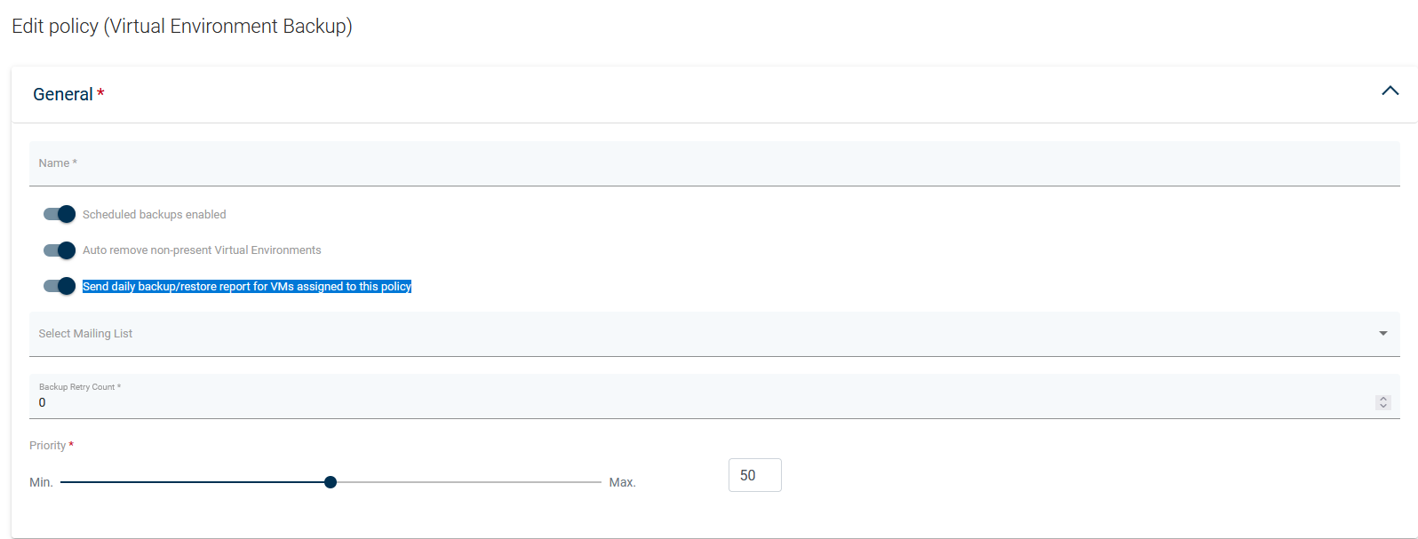 Find the backup policy in which you want to use the mailing list and click it to enter Edit policy the page. Enable Send daily backup/restore report for VMs assigned to this policy option and select mailing list.