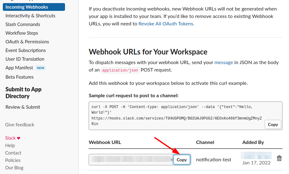 2. From the Features page, toggle Activate Incoming Webhooks on. Click Add New Webhook to Workspace.