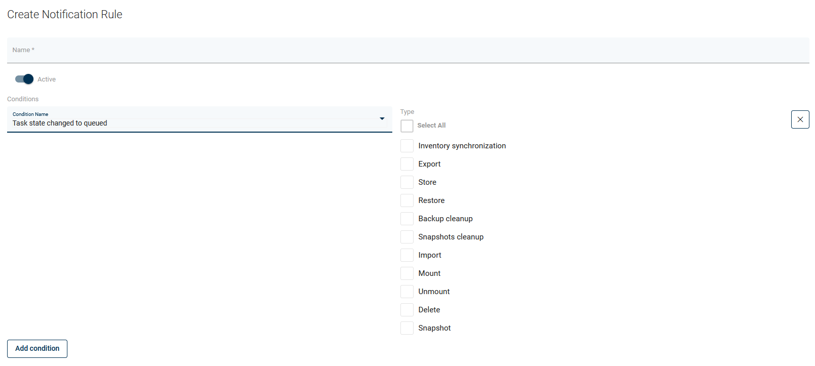 Fill in a name for your rule, set your notification to active and add one or more conditions from a list.