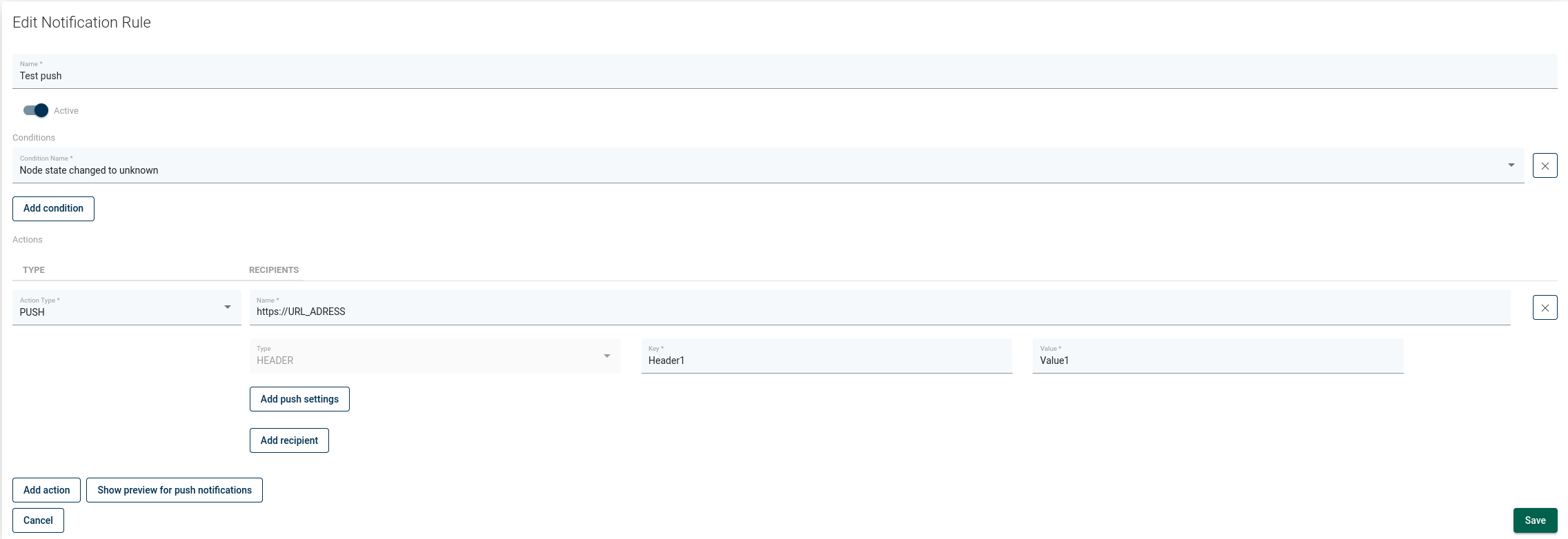 To configure a push notification, provide URL of endpoint address, where you want to receive notifications and add if needed custom headers that will be added to POST request with notification.\