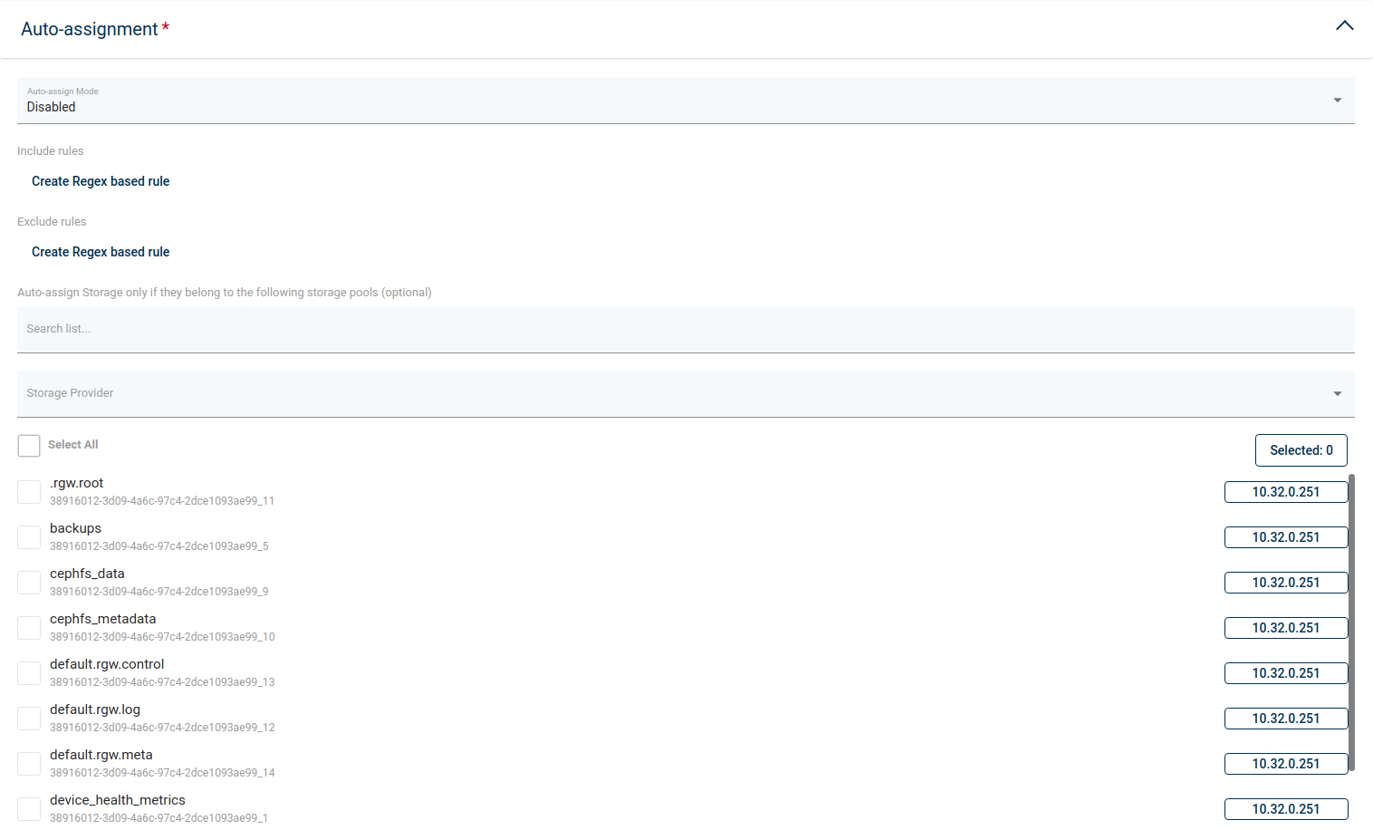 - Include or exclude rules based on regular expression matching Storage Instance name, i.e.: