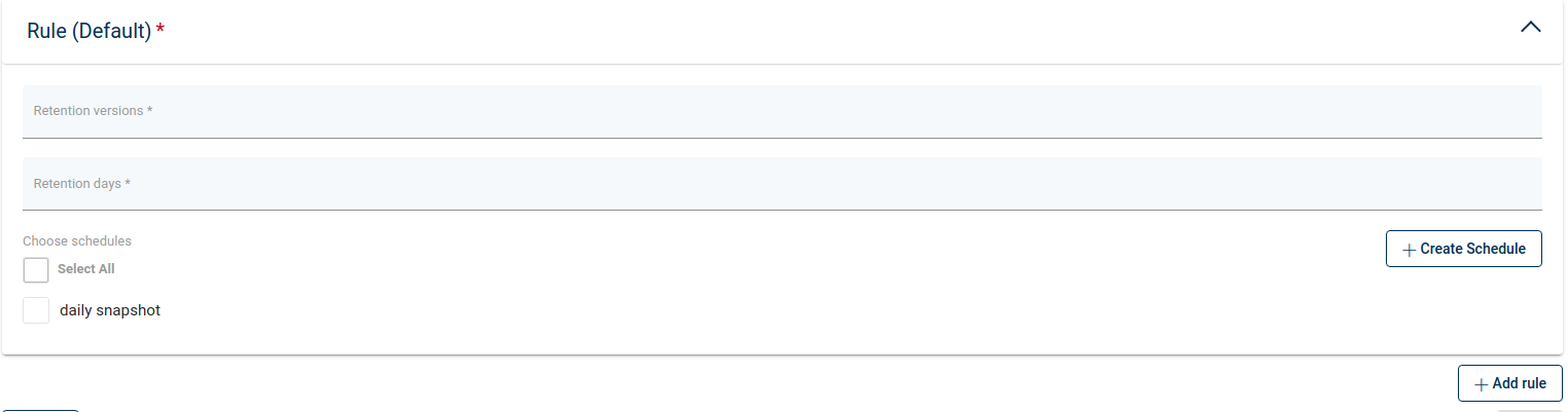 Provide retention settings - how many snapshots (created by this policy) will be kept and for how long. If you have already created a schedule, you can also select it.