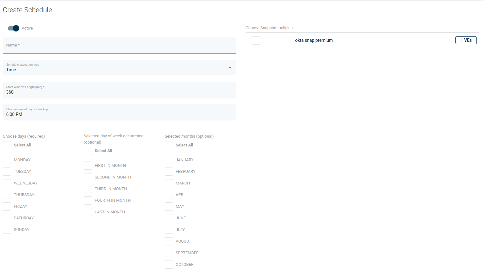 The schedule defines when and on which days snapshots should be created. To define a new schedule use the