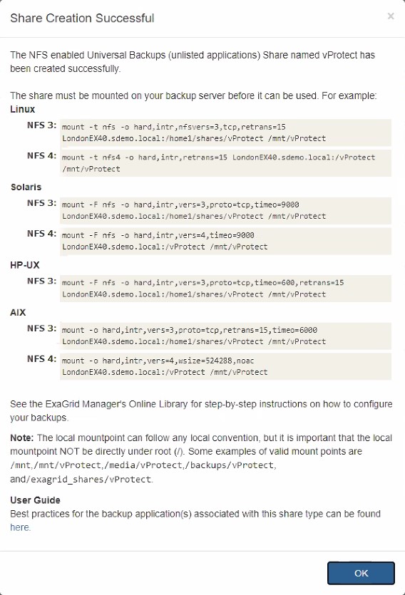 After creation, you will see a summary window with commands that allow you to mount the NFS share under the DPX vPlus node machine.