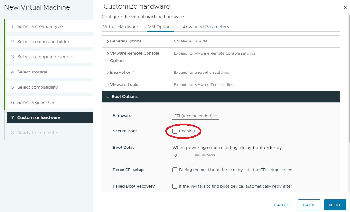 VM Options: Verify that "Secure Boot" is disabled in the VM Options section.