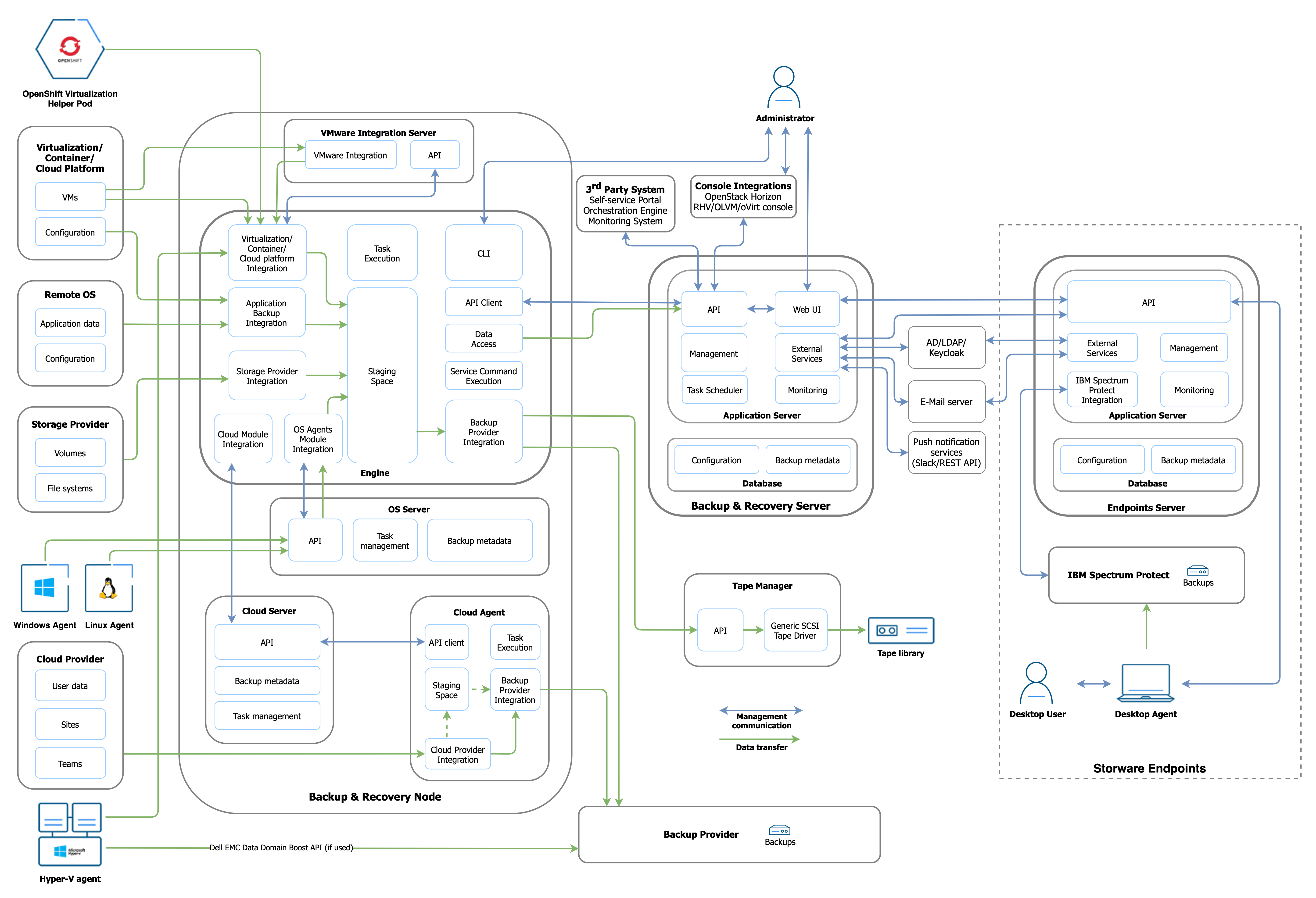 This component is used to manage data movement. The component is responsible among others for performing operations like backup, restore, and mount. Multiple nodes can be connected and managed by the same DPX vPlus server. Depending on the type of protected systems and data, multiple nodes can be deployed for example for scalability.