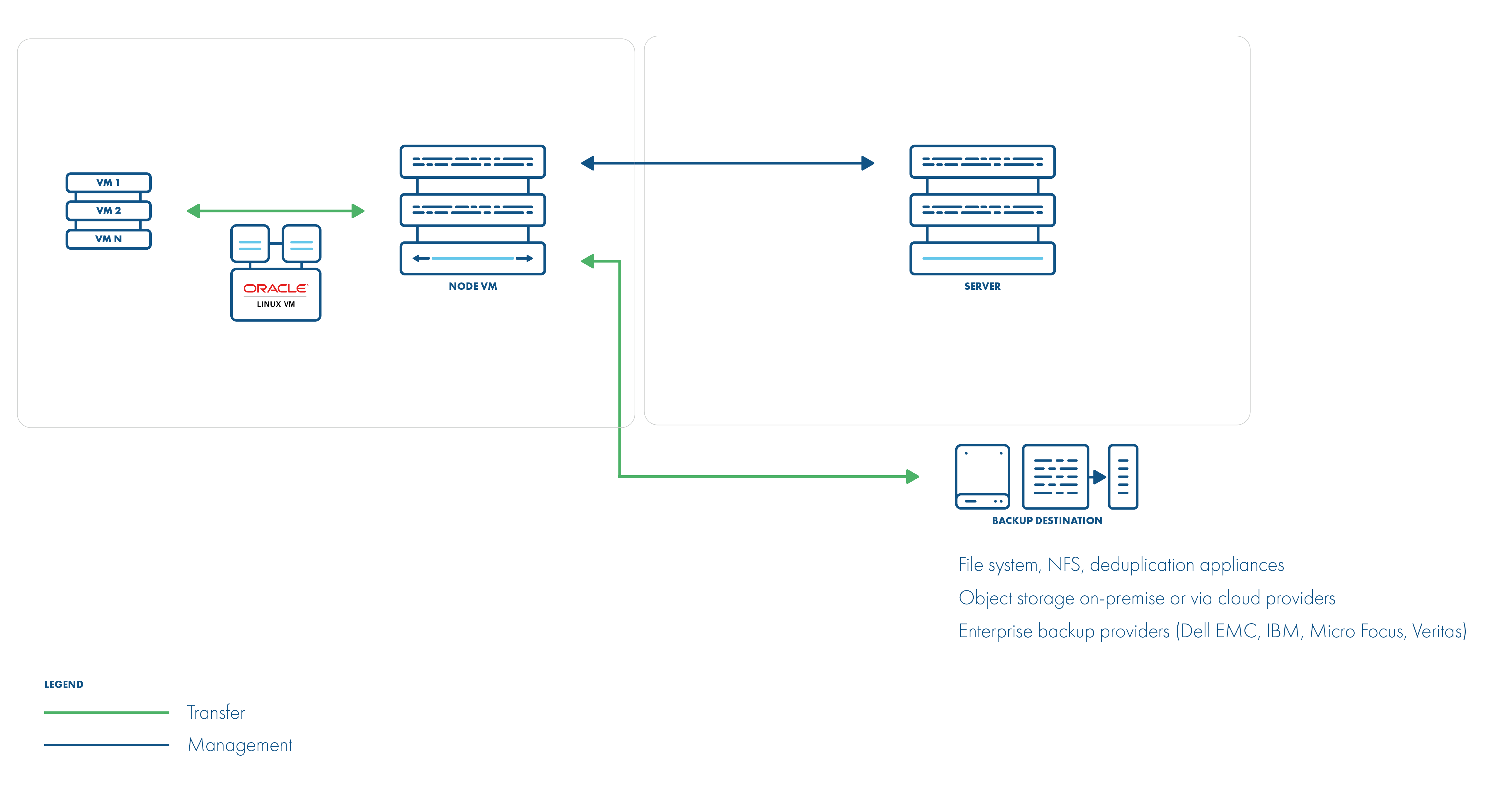 Different strategies require a node to be installed either as a VM in the environment that you back up or installed separately.
