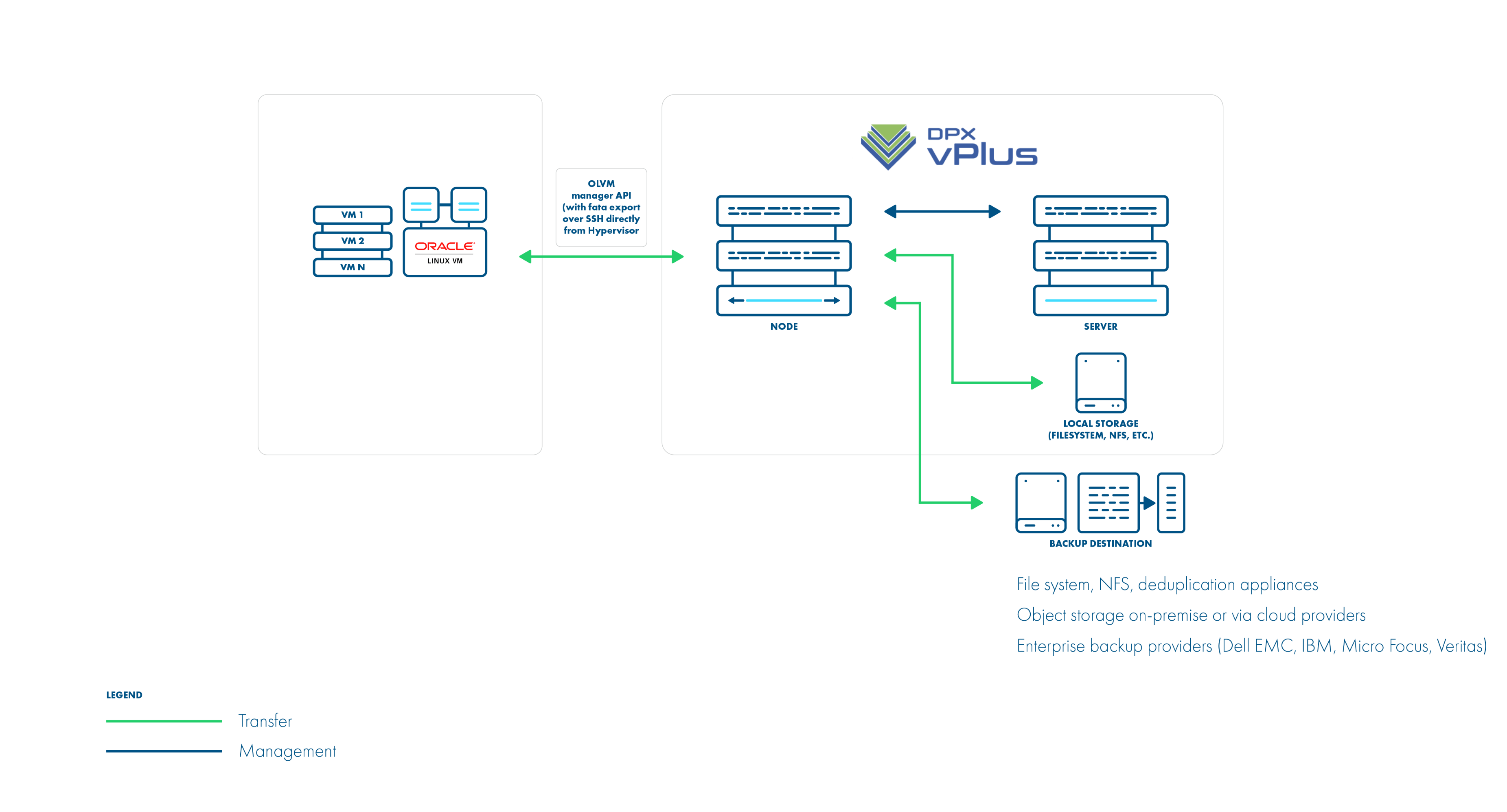 This is an enhancement to the disk image transfer API strategy. It allows DPX vPlus to use OLVM API v4.2+ (HTTPS connection to OLVM manager) only to collect metadata. Backup is done over SSH directly from the hypervisor (optionally using netcat for transfer), import is also using SSH (without the netcat option). There is no need to install a node on the OLVM environment. This method can significantly boost backup transfers and supports incremental backups.