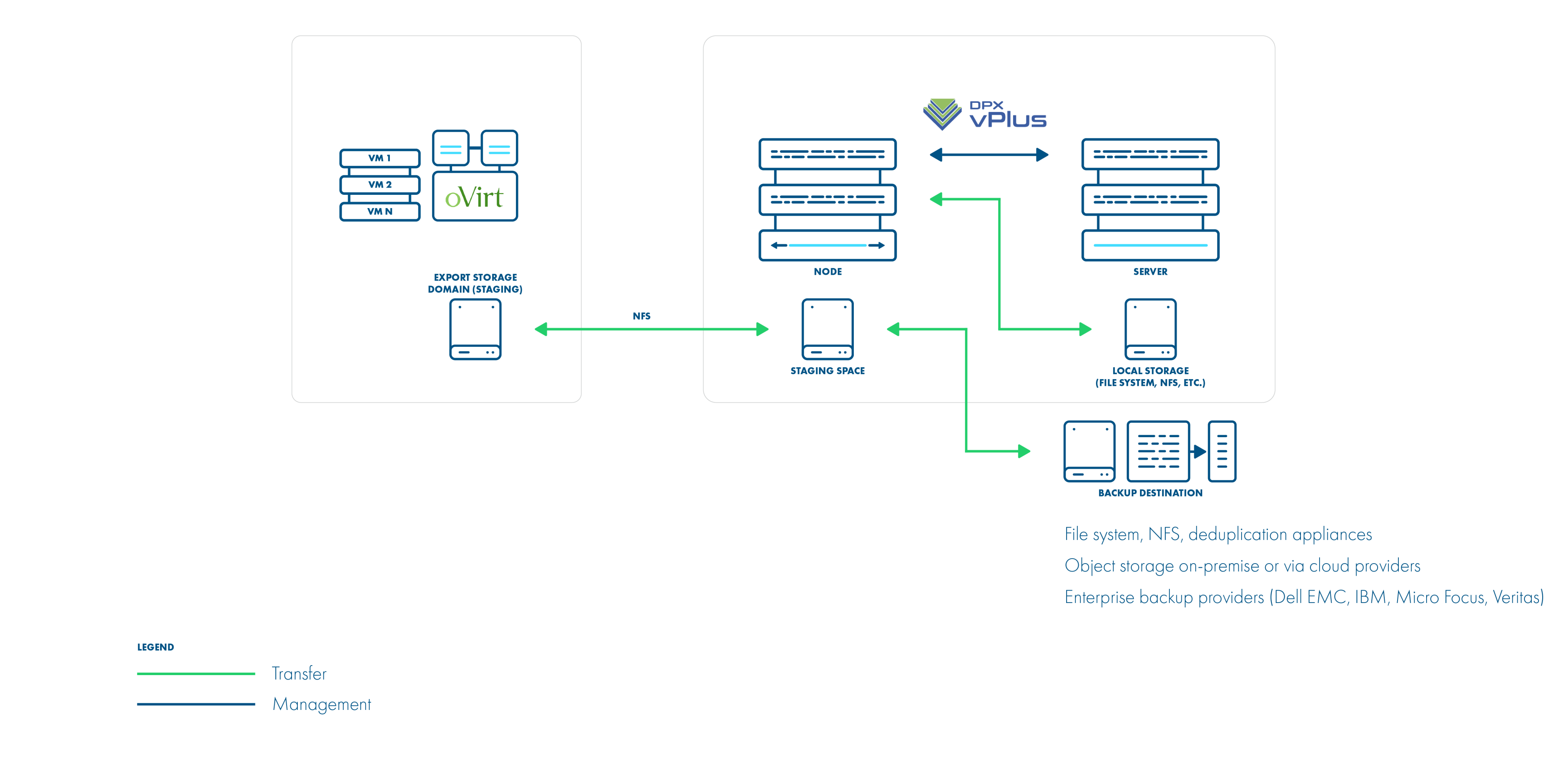 The backup process requires that once a snapshot is created it will be cloned and exported (in fact to DPX vPlus Node staging). The reason for additional cloning is that oVirt doesn’t allow you to export snapshots directly. The Node can be outside of the environment that you back up.