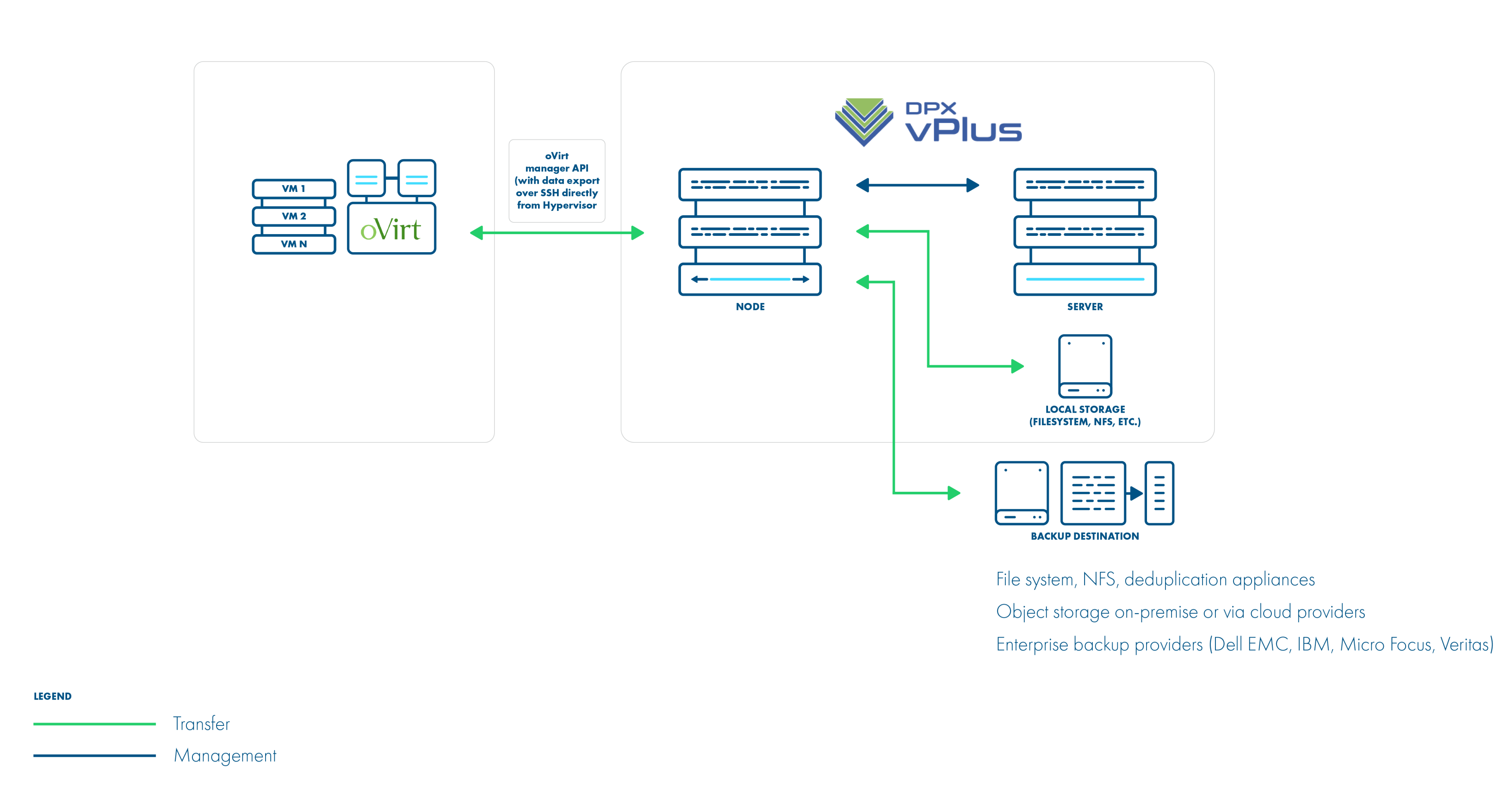 This is an enhancement for disk image transfer API strategy. It allows DPX vPlus to use oVirt API v4.2+ (HTTPS connection to oVirt manager) only to collect metadata. Backup is done over SSH directly from the hypervisor (optionally using netcat for transfer), import is also using SSH (without the netcat option). There is no need to install a node in the oVirt environment. This method can significantly boost backup transfers and supports incremental backups.