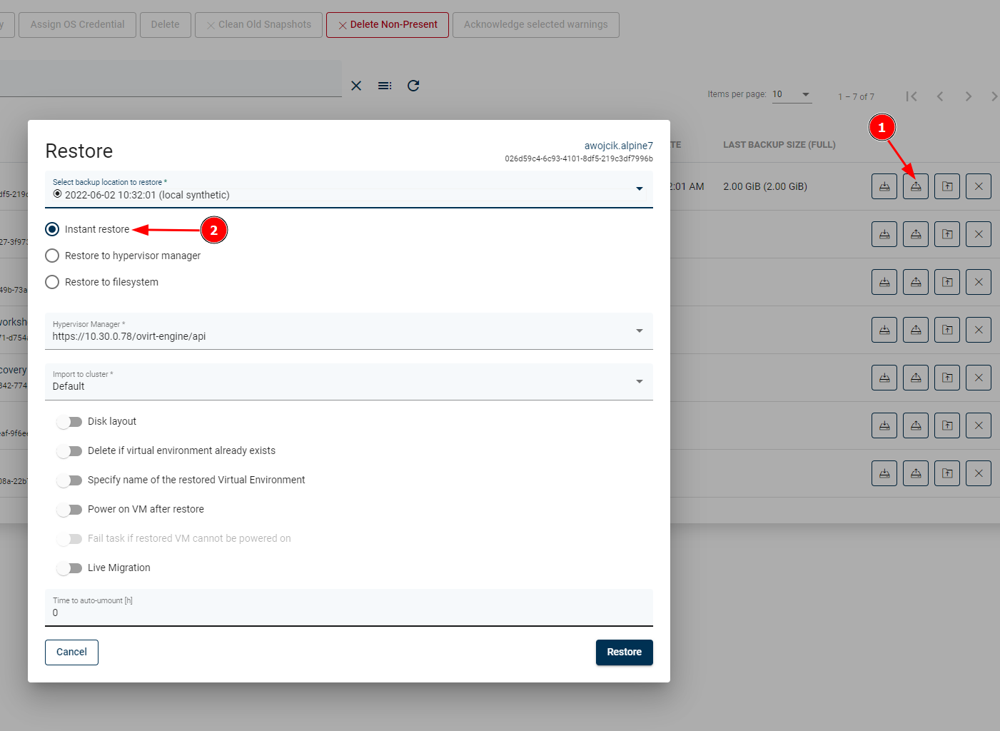 To use an instant restore feature, backup destination from which VM will be restored, has to be of a synthetic type. The restore process creates a NFS share on the DPX vPlus node, later this share is attached to the RHV as a new storage domain. Then it creates a new virtual machine and attaches the disks from the newly created storage domain to it. To use instant restore you have to click the restore button in the instances list and choose the option instant restore.