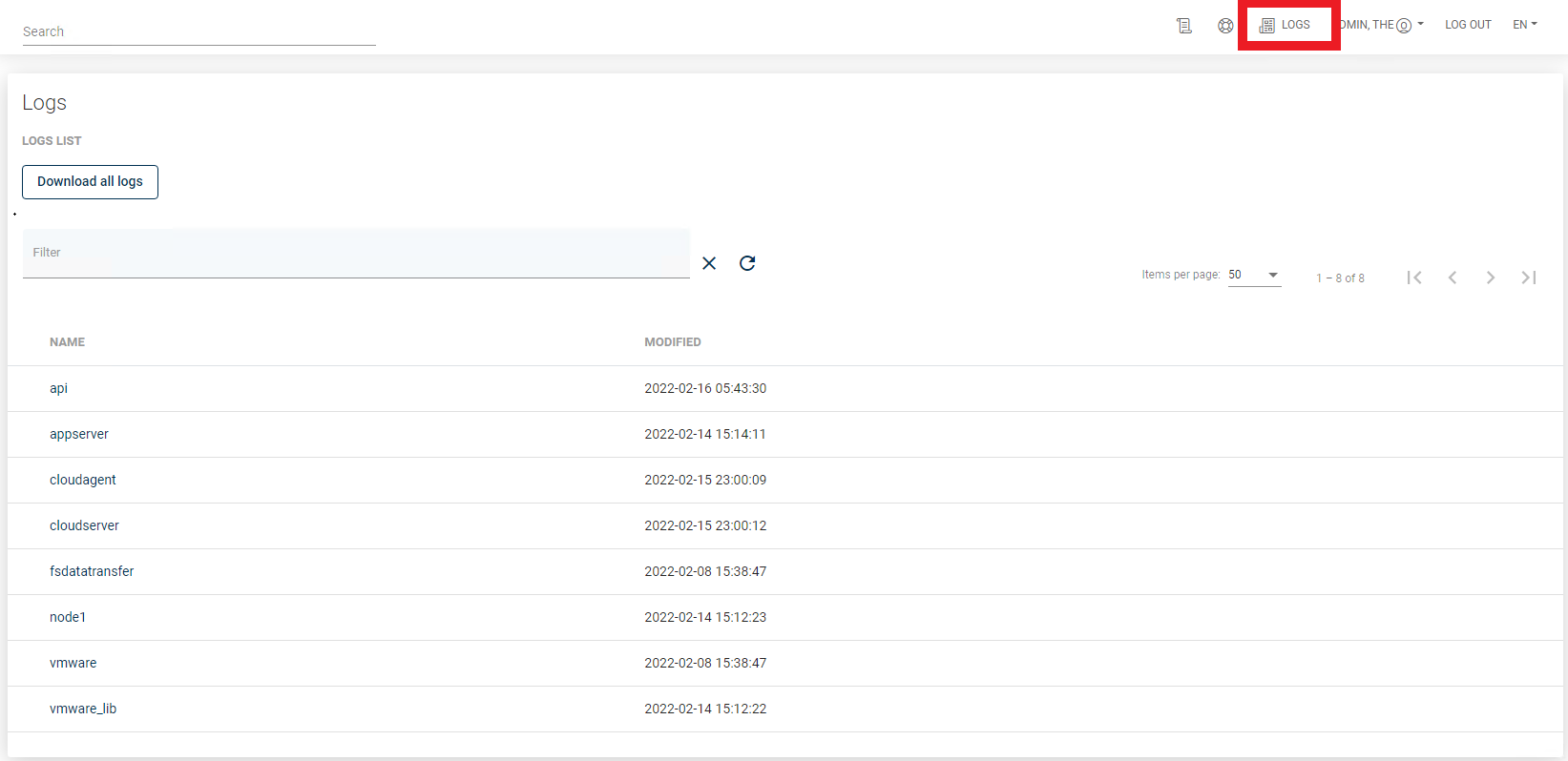 appserverwhich has all messages coming from the application server - which hosts web UI and APIapiwhich has all messages related to - the core DPX vPlus Server applicationcloudagentwhich has all messages from Storware Cloud Agentcloudserverwhich has all messages from Storware Cloud core part