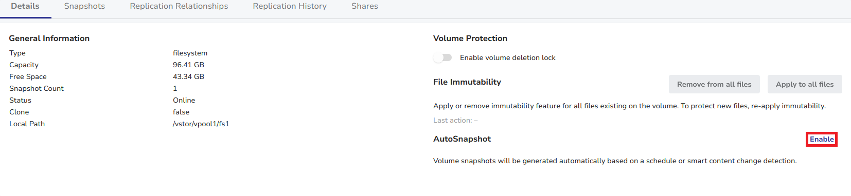 After selecting the appropriate mode and customizing the setting, click Enable AutoSnapshot. AutoSnapshot settings will now be visible in the volume view.