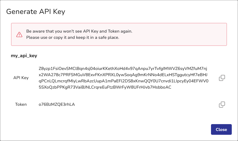 The API key and token are only shown once after they are generated. Make sure to copy and save them in a secure place or use the credentials right away.
