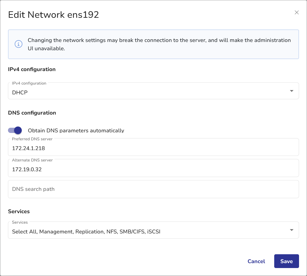 - Network settings: DHCP/static IPv4, DNS, service protocols like iSCSI.