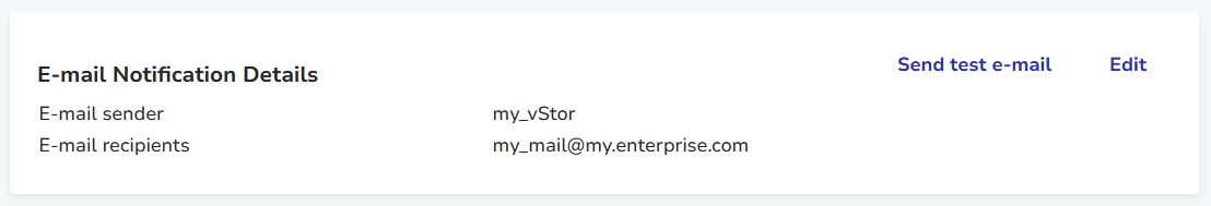 This section gathers e-mail notifications configuration for your vStor instance.