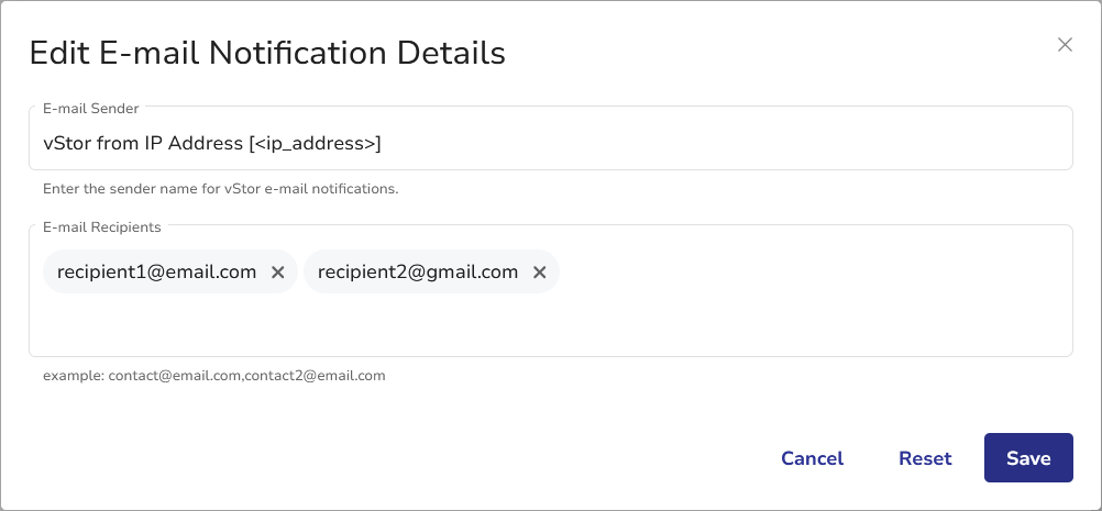 Enter the e-mail addresses that will receive notifications. Multiple recipients can be added by separating them with commas.