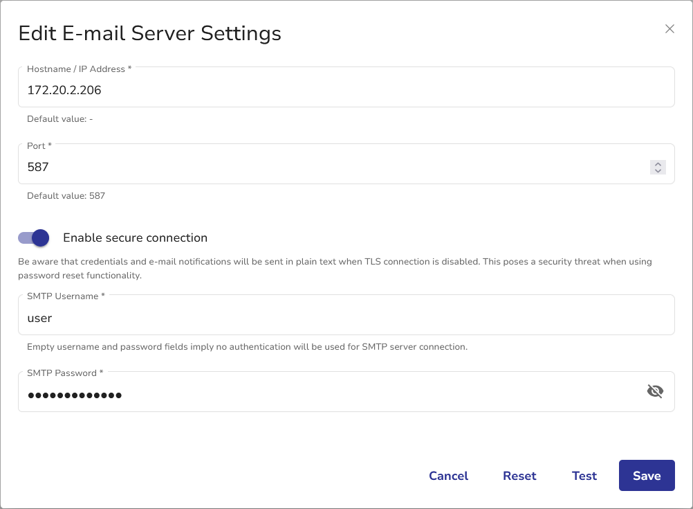 - Click the Test button to verify the e-mail server data (optional).