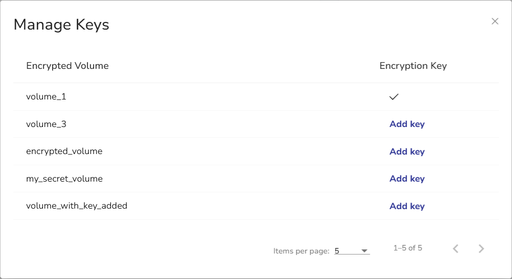 The Manage Keys dialog window shows the list of all encrypted volumes on the vStor. Volumes with encryption key added to the Encryption Keystore are marked with .