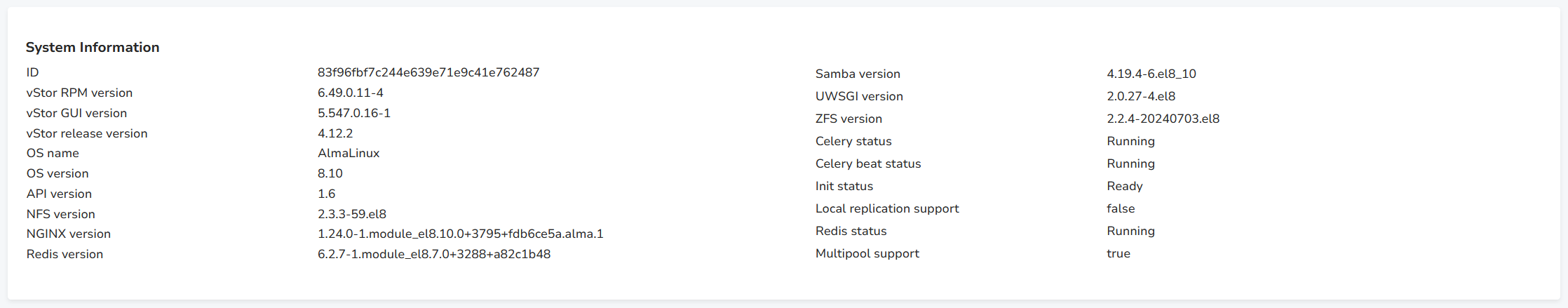 This section gathers general information about the vStor’s OS, library versions and statuses.