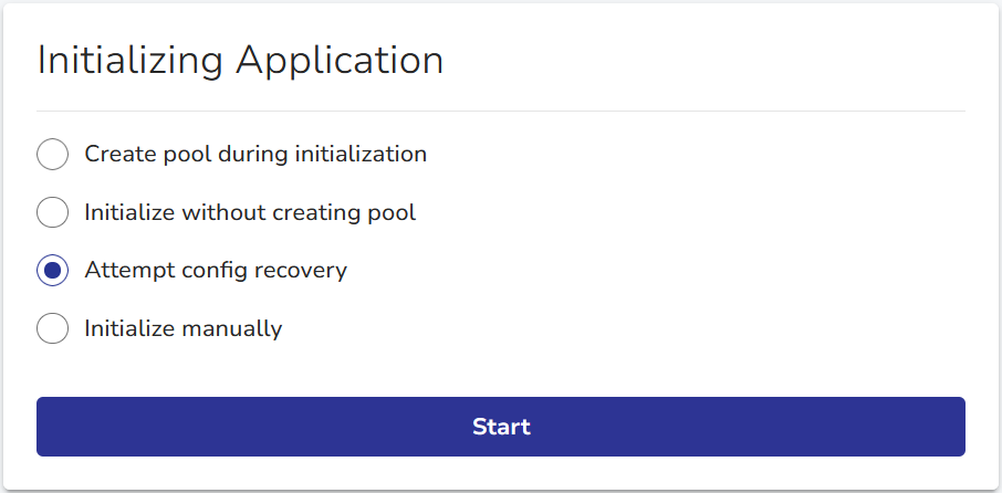 Attempt config recoveryat the prompt.\![[image expected here]](/assets/images/deploy fresh vstor - initializing application-0d25aad5d64fe9e28b3de5527a75d488.png)