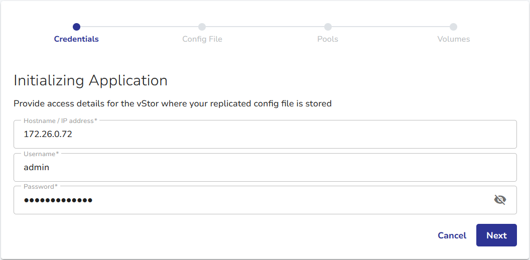- In the Credentials step, specify the hostname or IP address of the vStor where the replicated configuration file is stored, and provide user credentials for the user with access to the replicated configuration volume.