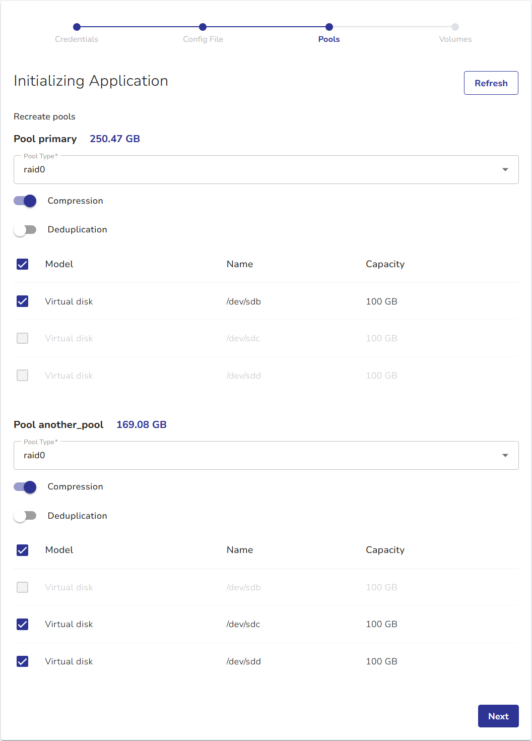 - In the Pools step, select disks for each recreated pool. Compare the pool size with the disk capacity to ensure enough volume space is assigned.