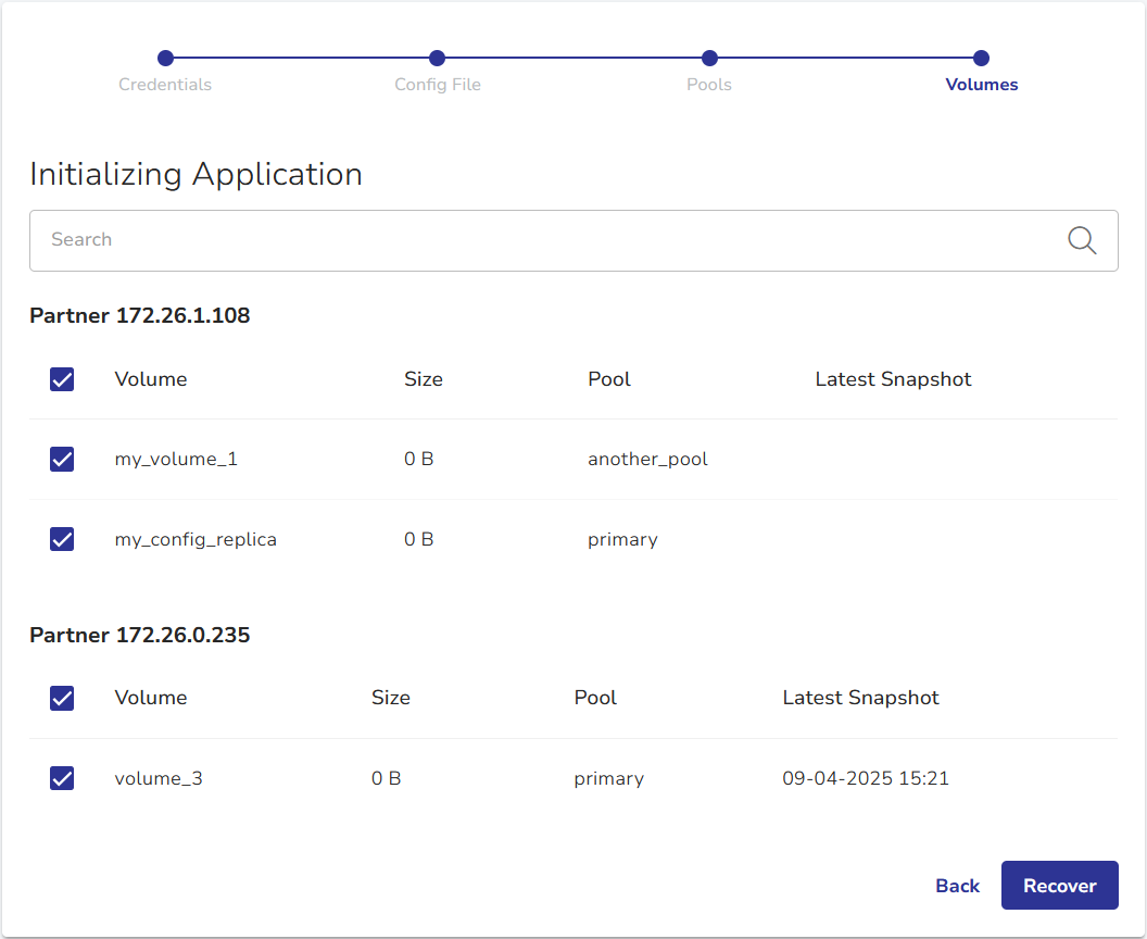 Recovering all volumes may take some time. If you need to urgently recover particular volumes, select only those volumes in the Volumes step. You can manually recover the remaining volumes from the Storage view when the initialization process is completed.
