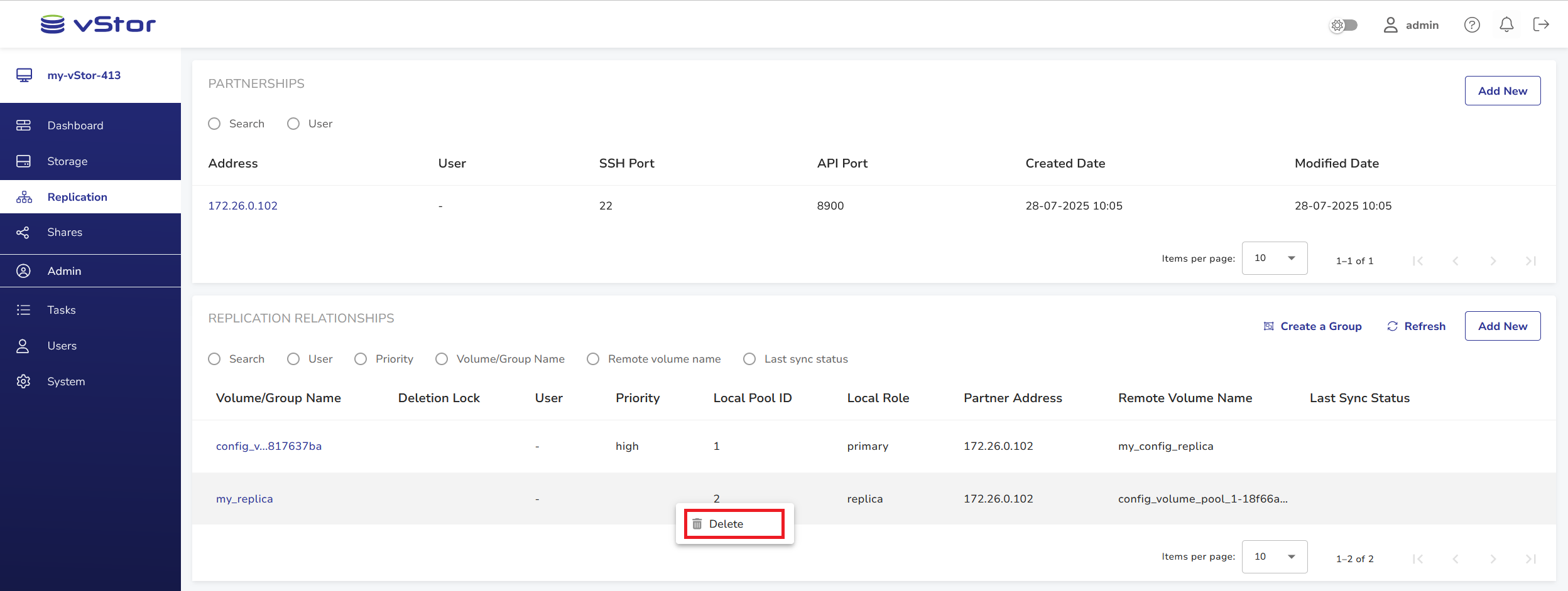 Once a vStor partnership is established, you can create a replication relationship between volumes on partner vStors. To create a replication relationship: