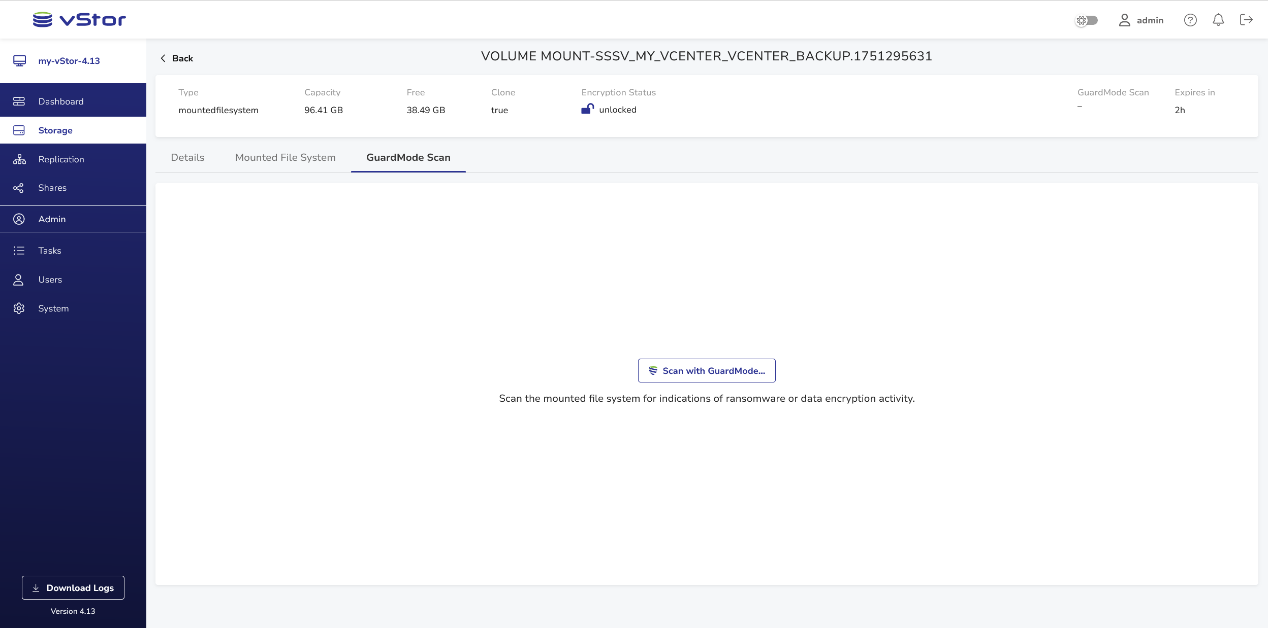 - In the volume view of your mounted filesystem, go to the GuardMode Scan tab.