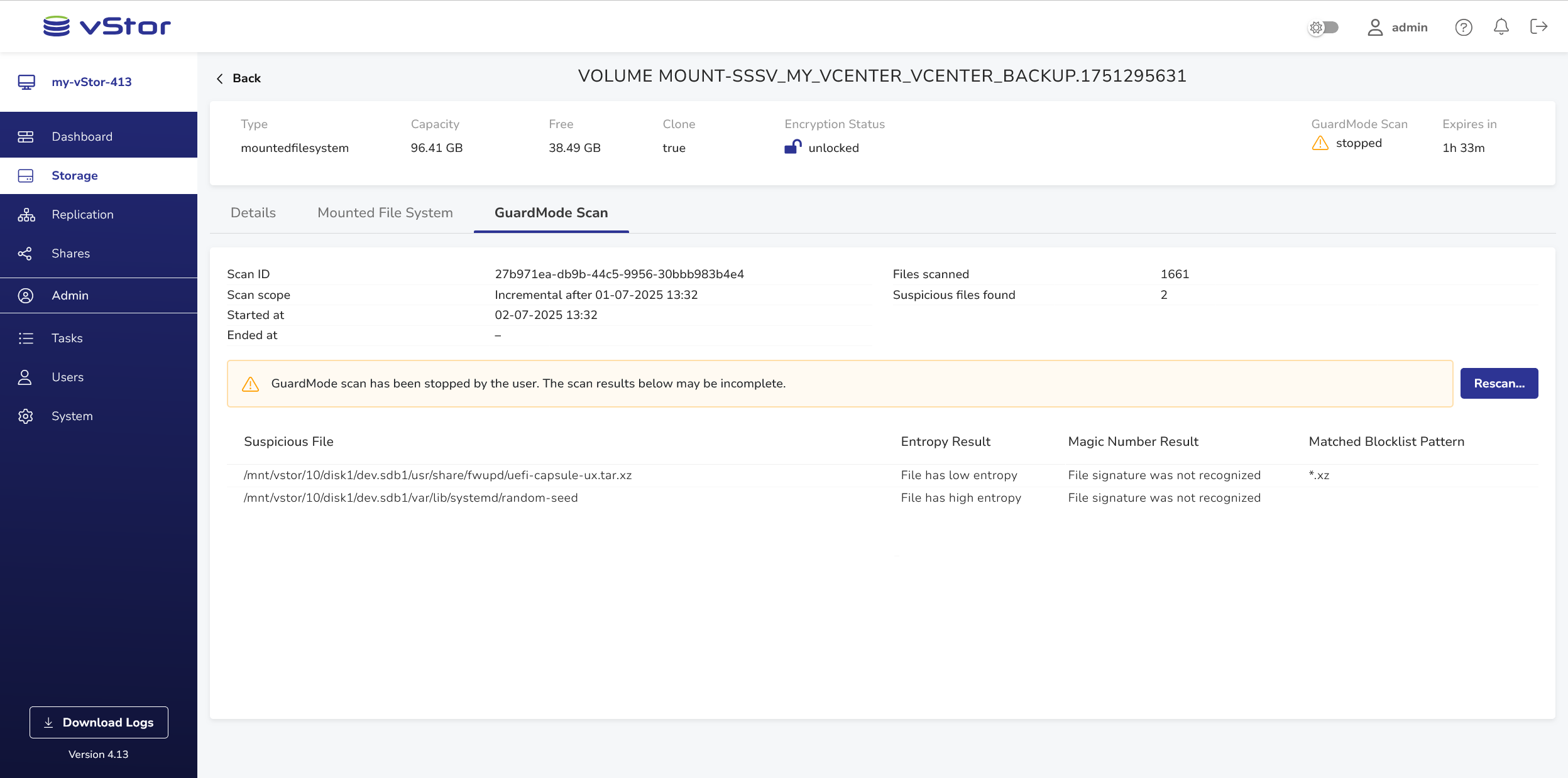 GuardMode Scan is a powerful feature that allows you to scan mounted filesystems for potential ransomware infections or malicious data encryption. This tool is particularly useful when you want to ensure the integrity of your data before restoring it to production environments.