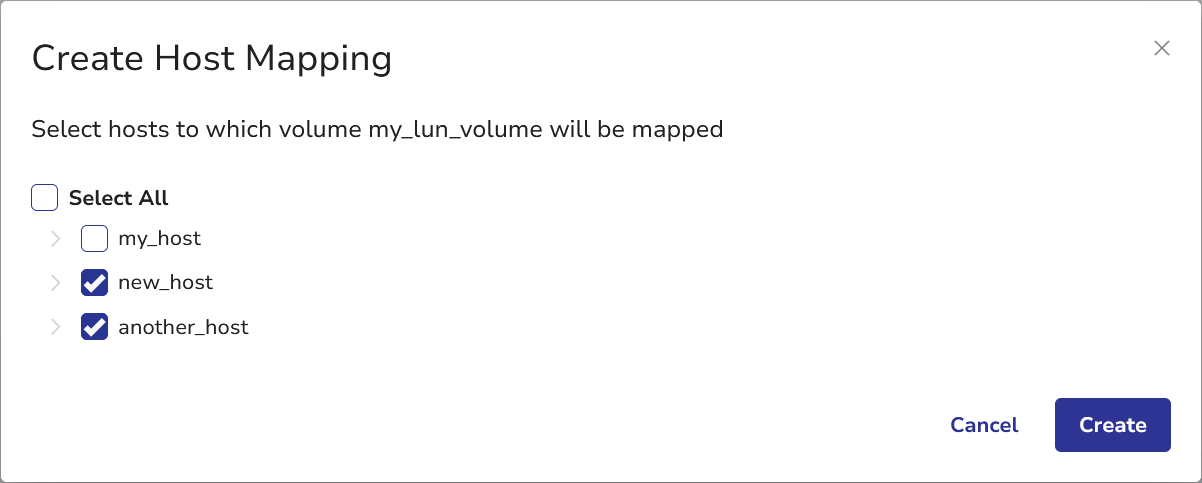 The Create Host Mapping dialog will appear. - Use checkboxes to select the hosts to map the LUN volume.